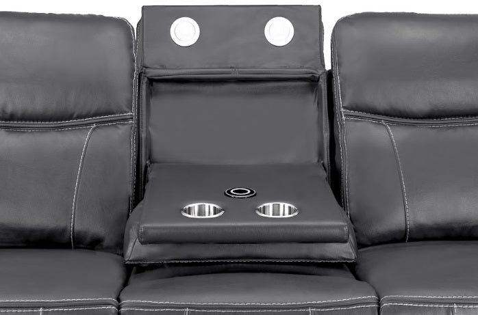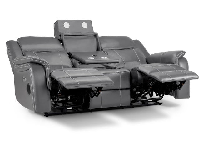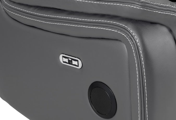 Available in Black Leather Aire, Grey Leather Aire, and Grey Fabric, the Galaxy Tech Sofa stands out with its contrast stitching, padded armrests, and a centre console for added convenience and storage.