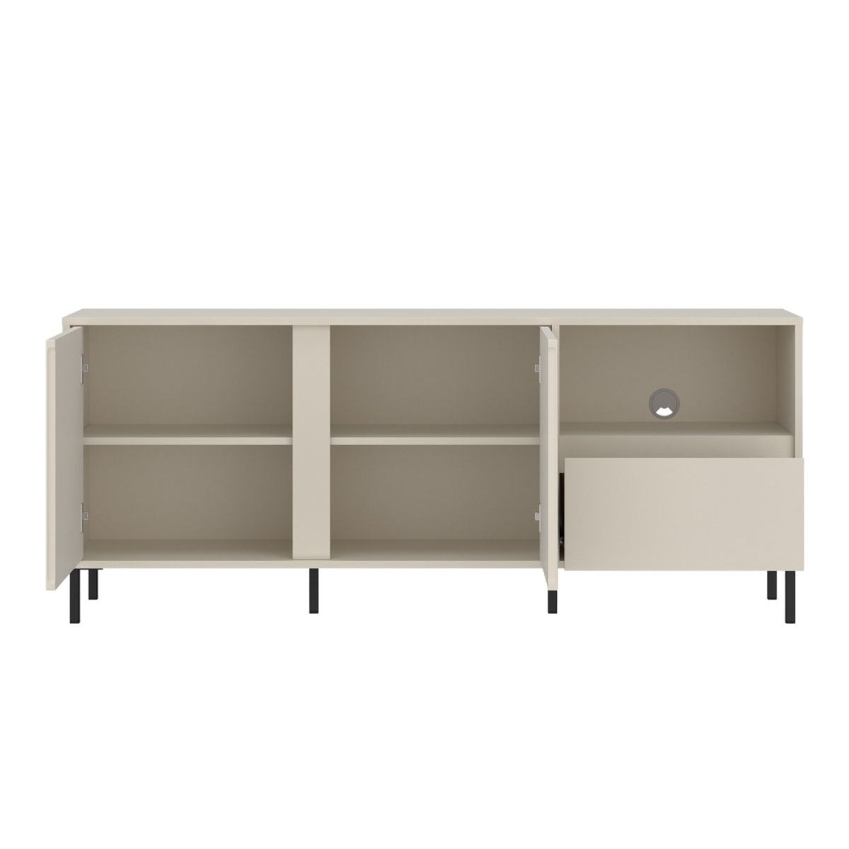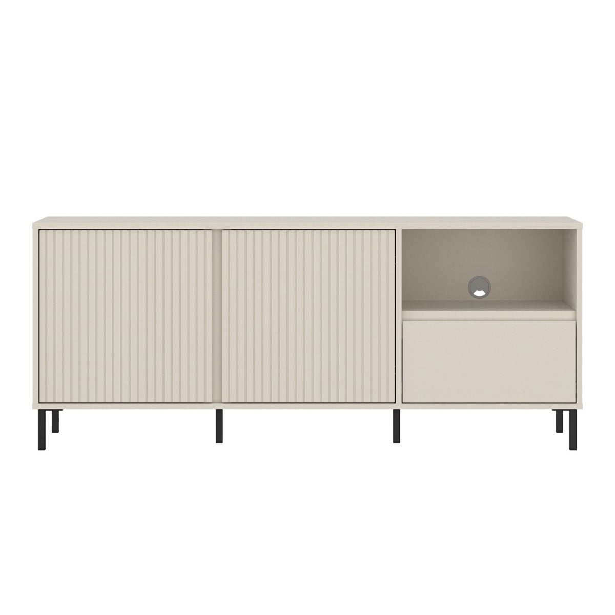 Two soft-close doors open to reveal internal shelving ideal for sound systems, gaming consoles, storage baskets, or media accessories. The central open recess with integrated cable outlet neatly houses consoles, set-top boxes, or soundbars requiring easy access. A full-extension drawer mounted on smooth ball-bearing slides keeps remotes, controllers, chargers, and cables organised and out of sight.
