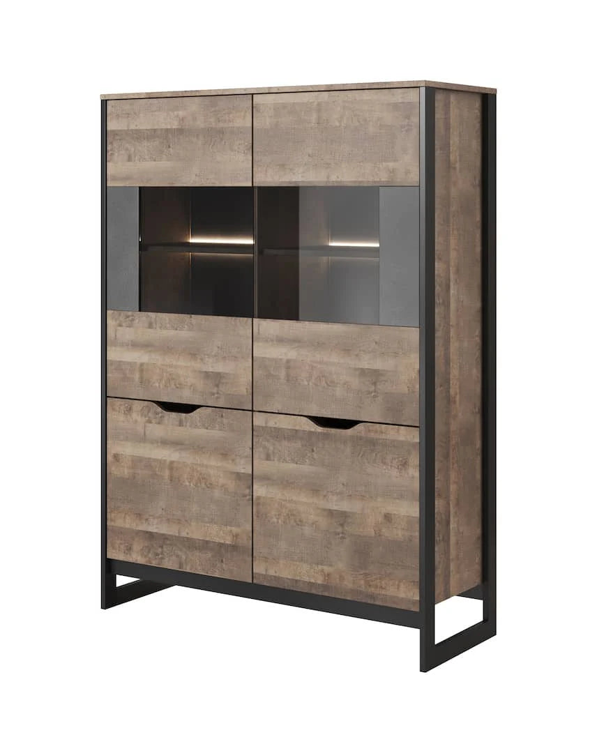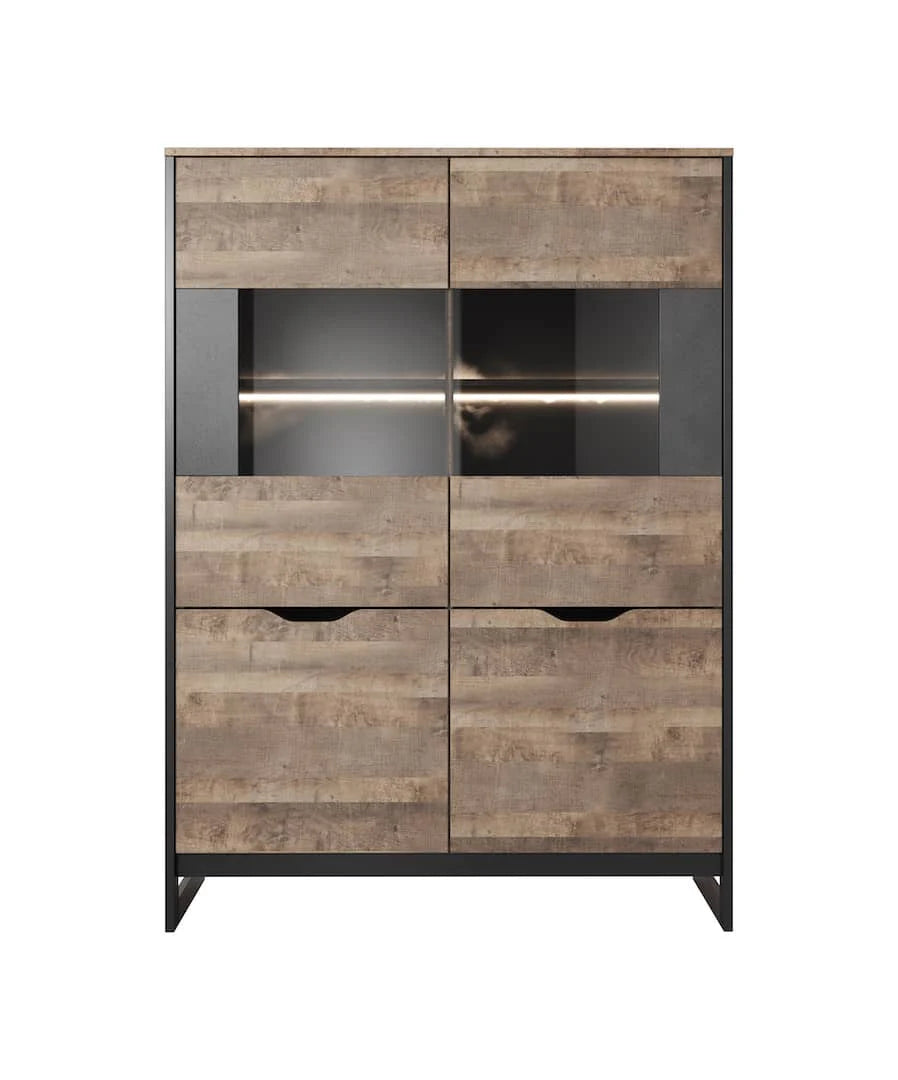 Unveil your treasures with the Arden display cabinet. This striking piece of furniture is perfect for storing or showcasing your most prized possessions, with its two partially-glassed doors giving a sneak peak of its spacious, LED-compatible interior. With a beautiful oak finish with black wooden legs, it will look stunning in any industrial or rustic style of home. A lighting set can be purchased separately.