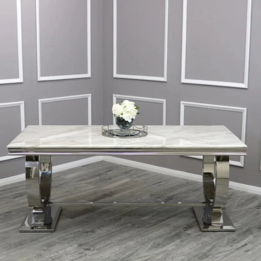 Looking to enhance your living space with a touch of sophistication and luxury. The Arriana Coffee Table is the epitome of style and glamour, designed for those with discerning taste. With its unique marble top and polished stainless steel double circular base, this coffee table is the perfect centerpiece for your chic and high-end home decor.