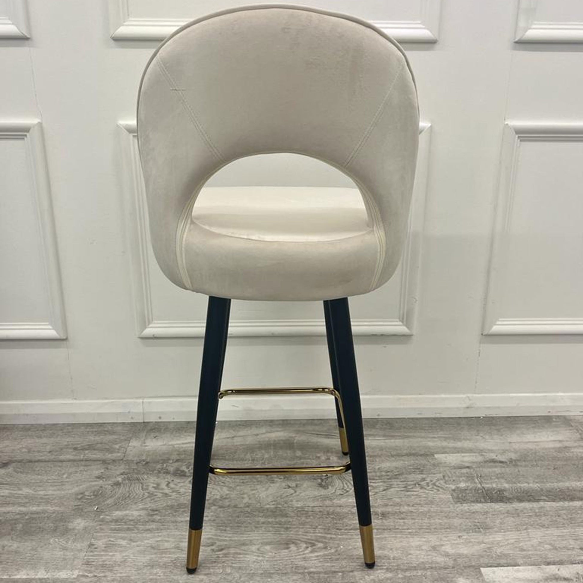 Style your breakfast table or bar. with this stunning Astra Cream Velvet Bar Stools. The chair features a beautiful subtle cream coloured cushioned design for comfort and a decorative curved open back rest. The chair is finished with sleek black Scandinavian legs trimmed with gold bottoms and a foot rest. Add a luxurious feel to your choice of dining room or kitchen with this velvet chair.