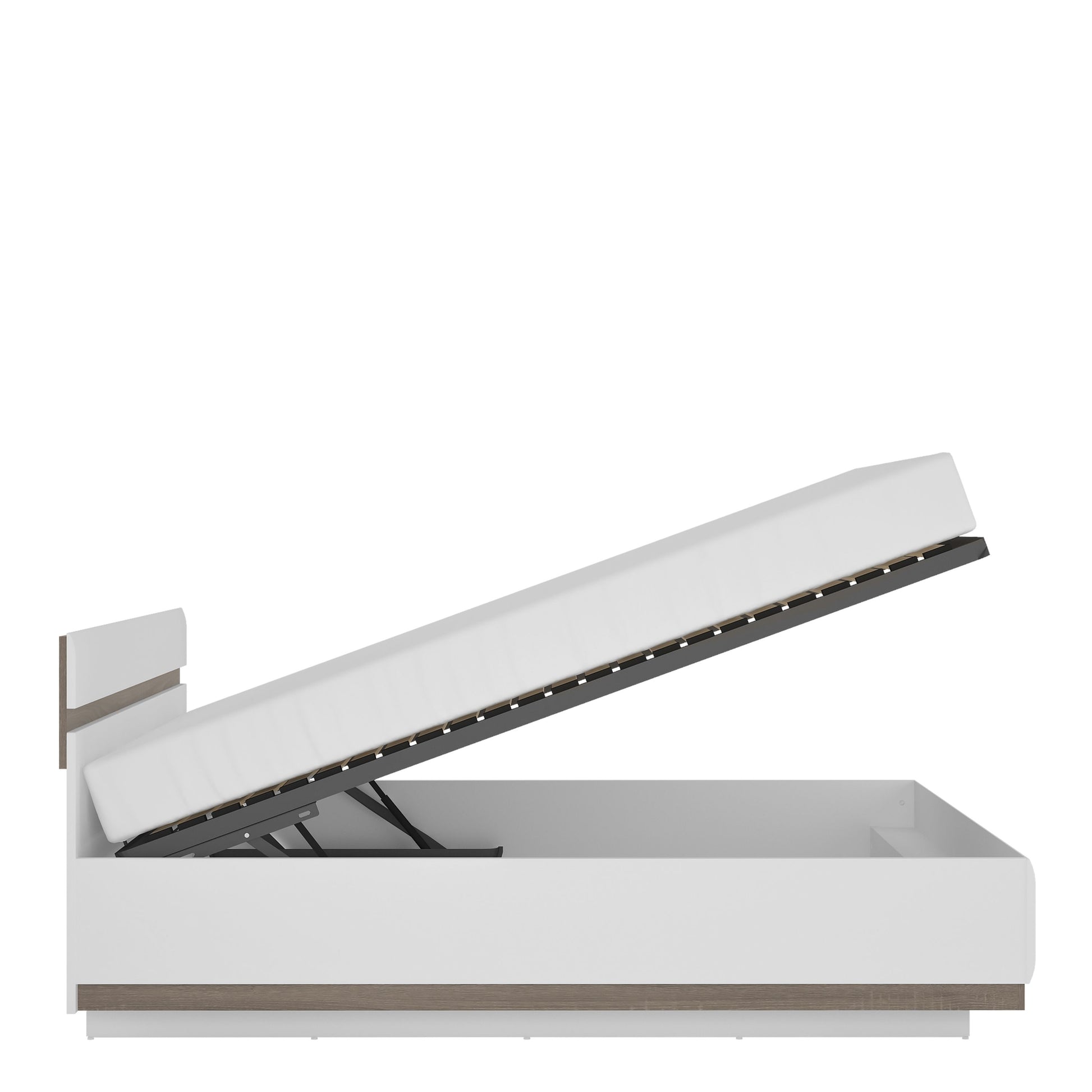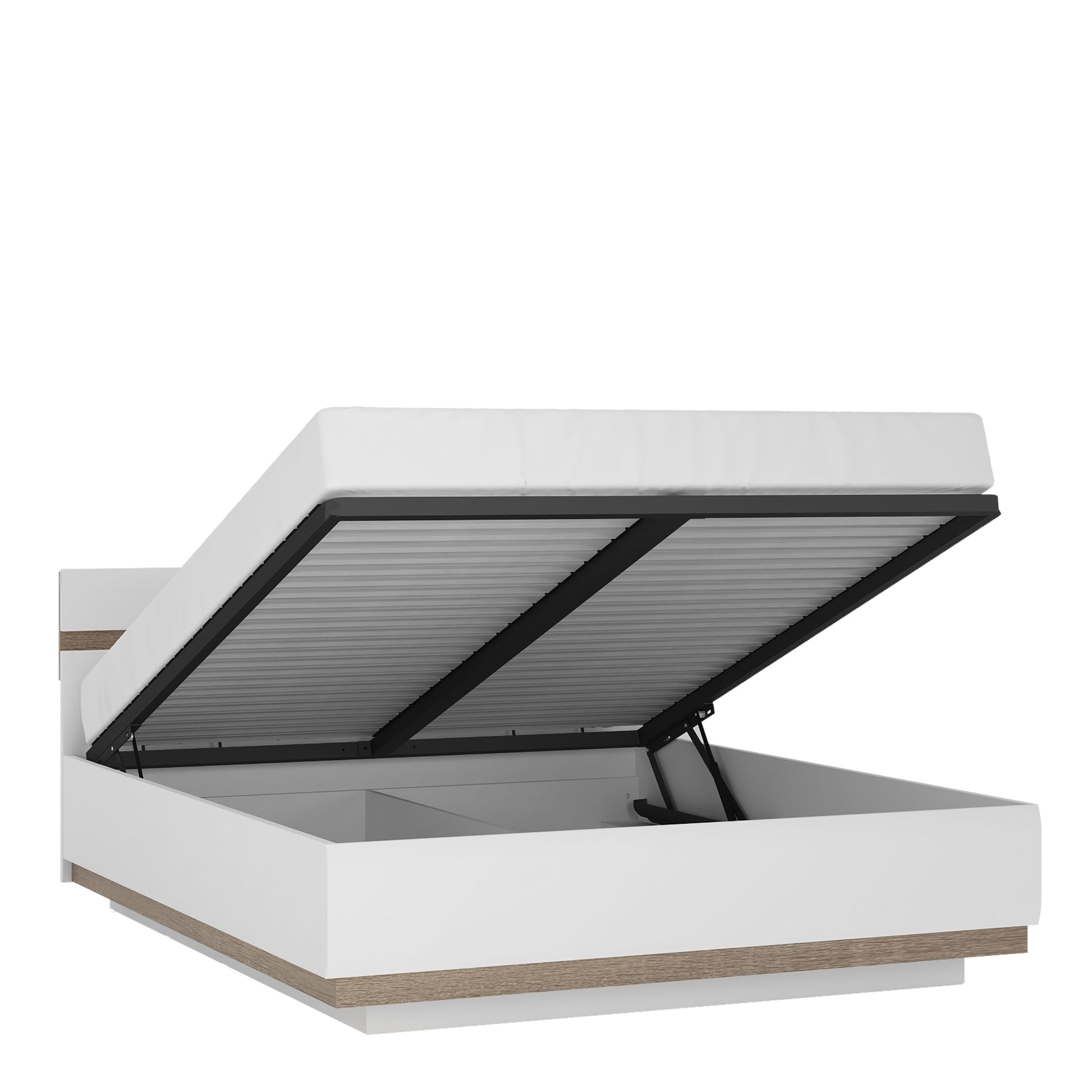 King Size Bed in white with an Oak trim with Lift Up Function. Unconventional design - a proposal for the followers of the latest trends. The clever mix of scratch resistant white melamine with beautiful high gloss sides and oak melamine trim makes this top quality collection of furniture the ideal destination for the most modern of homes, the massive range that includes many cabinets and wall units fulfils every storage and display option.