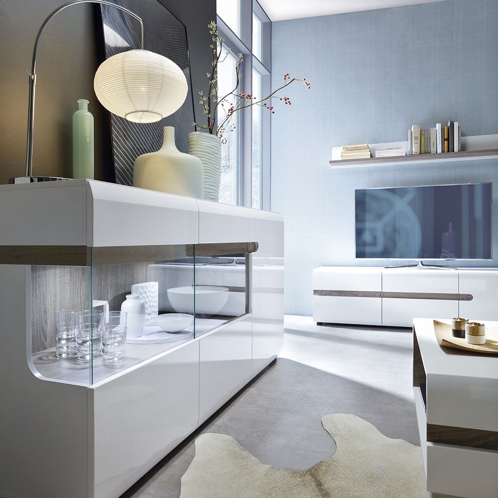 3 Door Glazed Sideboard in white with an Truffle Oak Trim. Unconventional design - a proposal for the followers of the latest trends. The clever mix of scratch resistant white melamine with beautiful high gloss fronts and oak melamine trim makes this top quality collection of furniture the ideal destination for the most modern of homes, the massive range that includes many cabinets and wall units fulfils every storage and display option.