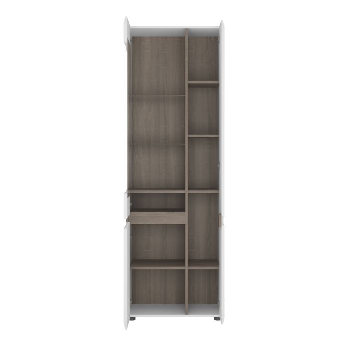 Tall Glazed Narrow Display unit (RHD) in white with an Truffle Oak Trim. Unconventional design - a proposal for the followers of the latest trends. The clever mix of scratch resistant white melamine with beautiful high gloss fronts and oak melamine trim makes this top quality collection of furniture the ideal destination for the most modern of homes, the massive range that includes many cabinets and wall units fulfils every storage and display option.