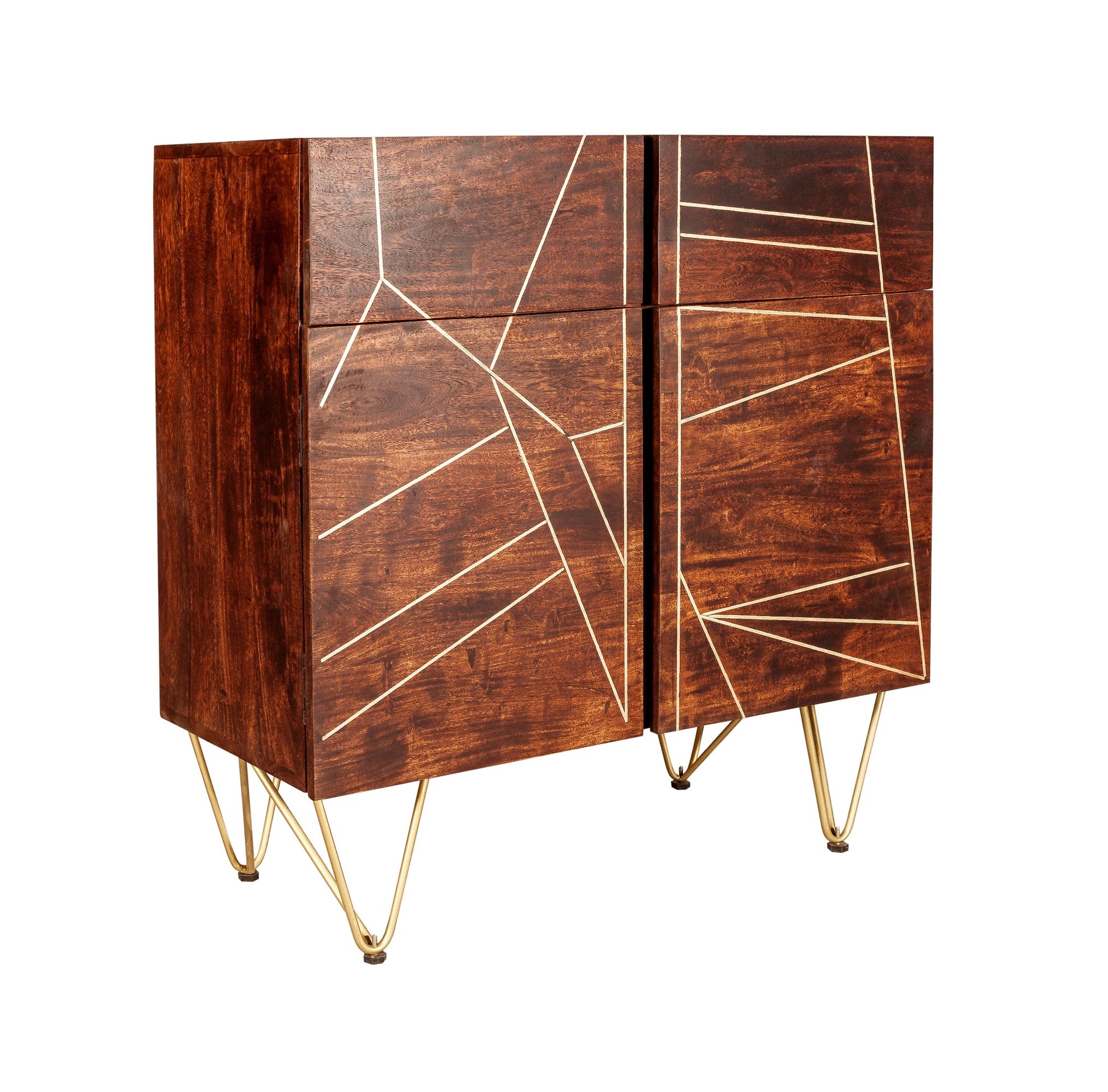 Medium sized sideboard with 2 drawers and 2 doors, with one interior shelf behind each door. The perfect addition to your dining room, providing plenty of storage space. This range is offered in a dark walnut finish, featuring gold metal inlays on the front of the unit. Drawer dimensions (HxWxD): 13x35x30 cm Cupboard dimensions (HxWxD): 28x42x32 cm upper shelf 22x42x34 cm lower shelf
