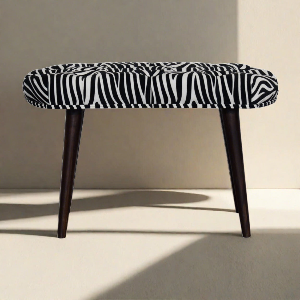 This Nordic style bench has been upholstered in a beautiful zebra print cotton velvet fabric and features a classy deep-button design on the top. The bench stands on 4 legs constructed from 100% solid mango wood in a walnut finish and it is the perfect piece to add to your bedroom or hallway as a finishing touch in the home.