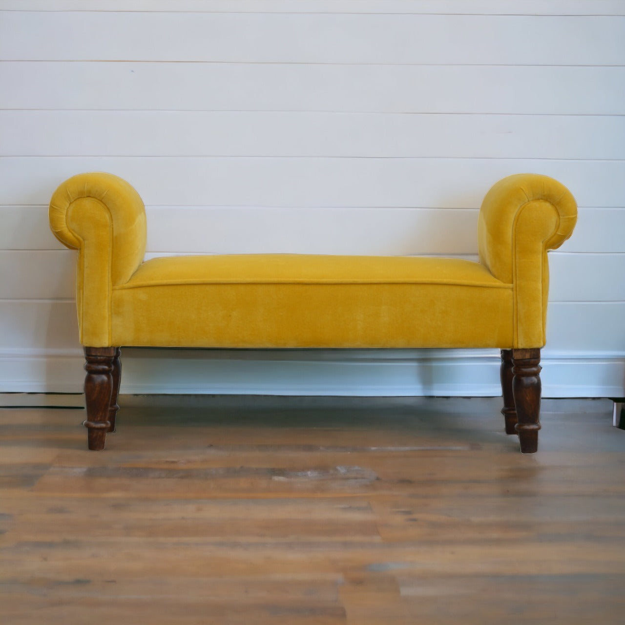 This lovely bench is ideal for a hallway, end of the bed, or simply any living area in your home which is also ideal for extra seating. In an amazing mustard yellow cotton velvet featuring turned legs constructed from 100% solid mango wood in a walnut finish. This bench will add a pop of color to any room and serve handy all over the home, available in many different colors.