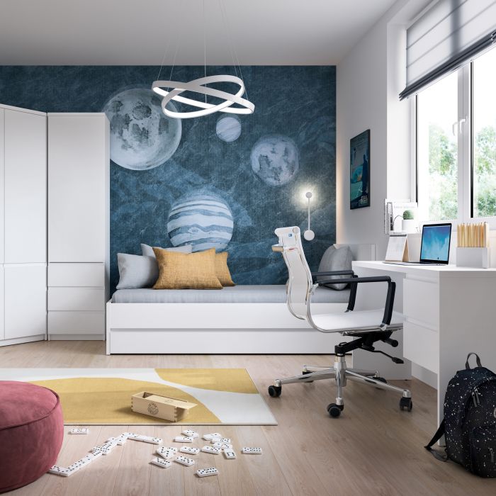 The white chiffonier has a practical storage solution and is a great alternative to a wardrobe. Three spacious drawers with the possibility of full extension and the space hidden behind the front of the furniture will work well in many rooms. The underwear has a handle-free system that is convenient to use. The body is universal, which means that it is extremely practical, it can be installed so that it opens to the left or right - the choice is yours. A simple, geometric form will be perfect for interiors decorated in a minimalist or modern style. The furniture is made of laminated chipboard, resistant to moisture, scratches, damage and high temperature. The program is available in two Color versions: Alpine White and Golden Ribbeck Oak.