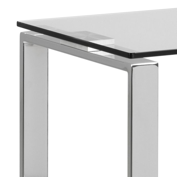 Indulge in the sleek design of this contemporary console table, featuring a pristine clear tempered glass top and a lustrous chrome steel sledge base. This piece marries minimalist aesthetics with robust construction, making it an ideal choice for a touch of modern sophistication in any space.