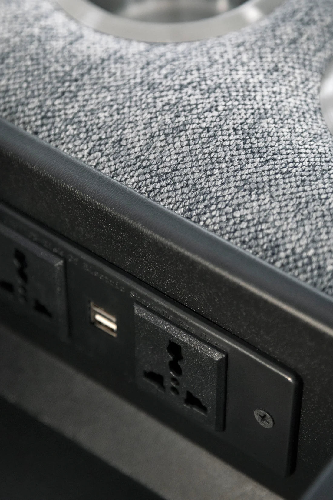 - Centre console with lift-up storage, plug sockets, and USB ports