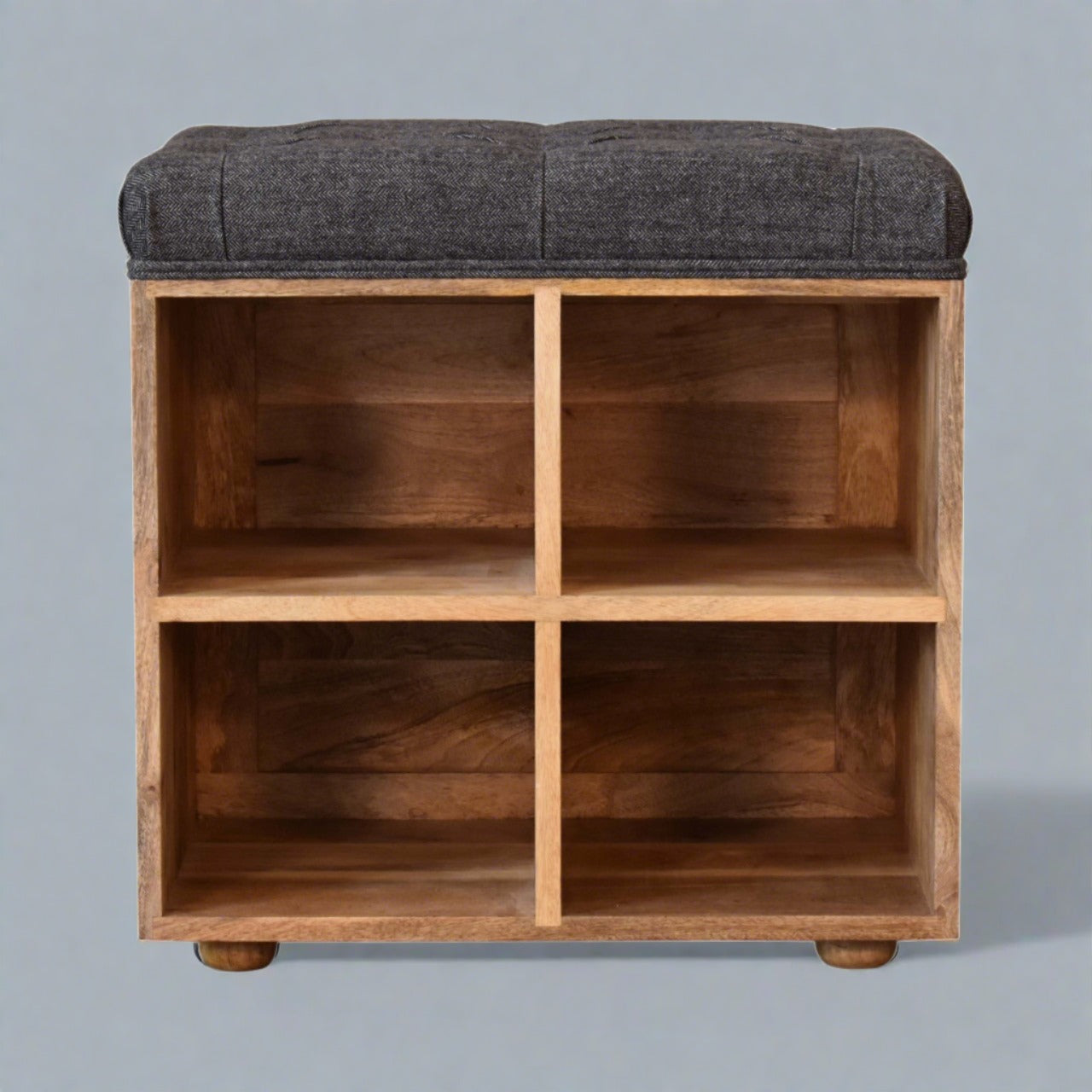 This mini storage bench is a practical piece of country furniture that will fit beautifully in your hallway. Being small, cute, and practical it is constructed from 100% solid mango wood and has a fine oak-ish finish with a seat upholstered in black tweed. This petite product is a part of Recession Collection.