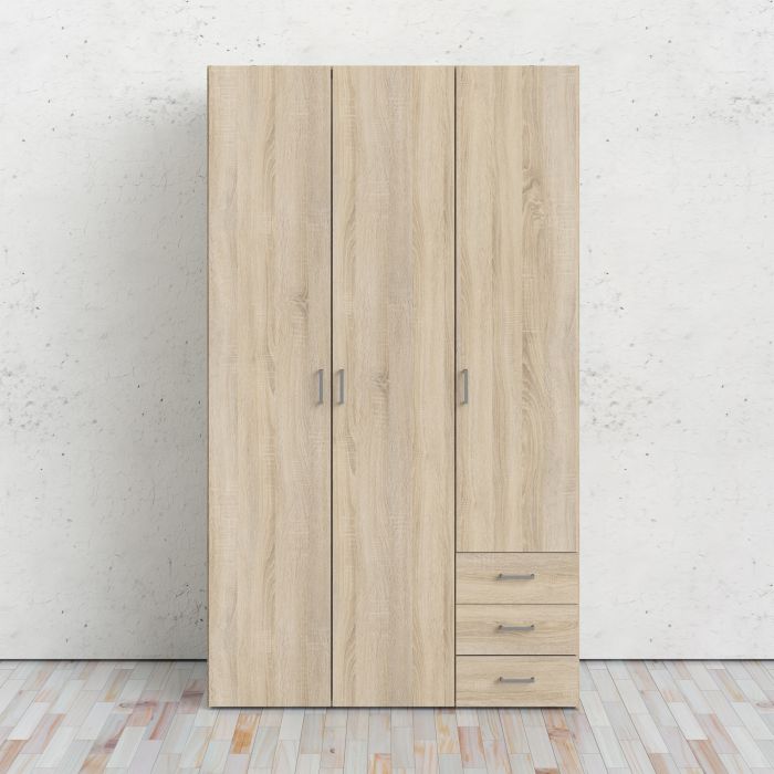 Space Wardrobe - 3 Doors 3 Drawers in Oak Make good use of your space - the clues in the name! The Space collection of bedroom furniture is convenient and ideal for creating useful storage while taking up a minimal footprint in your room.
