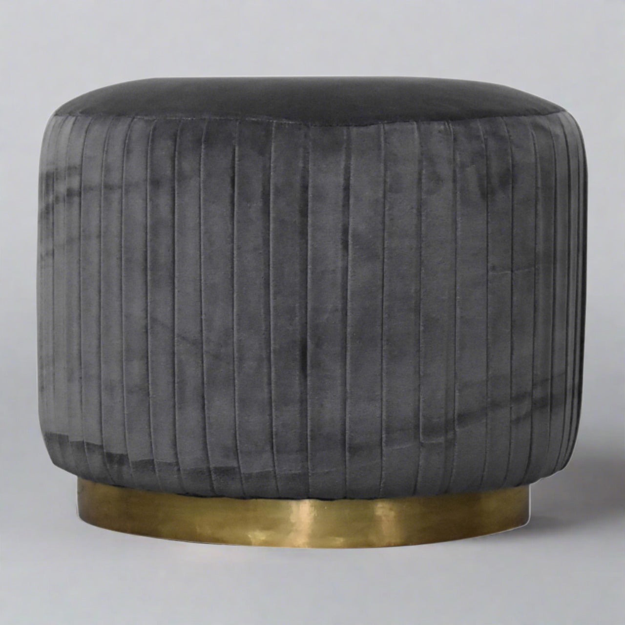 This beautiful and fashionable footstool will make the perfect addition to any bedroom or living room. It has been upholstered in a luxurious grey cotton velvet fabric with a pleated design featuring a gold brass base. Perfect for putting your feet up, using as a handbag stand, or as an accent piece in the home.