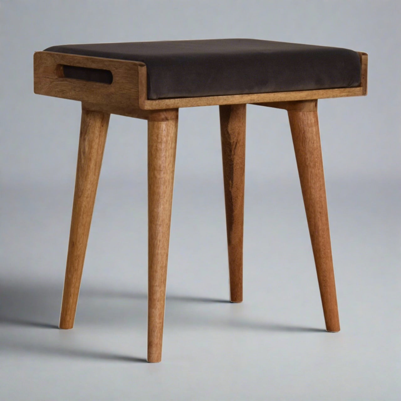 This footstool features a tray-style design and 4 Nordic-style legs constructed from 100% solid wood. It has been upholstered in a grey cotton velvet top that works as a comfortable seat and can be incorporated into many different interior styles as it offers a very clean and modern design, along with providing a nice contrast between the material and wood.