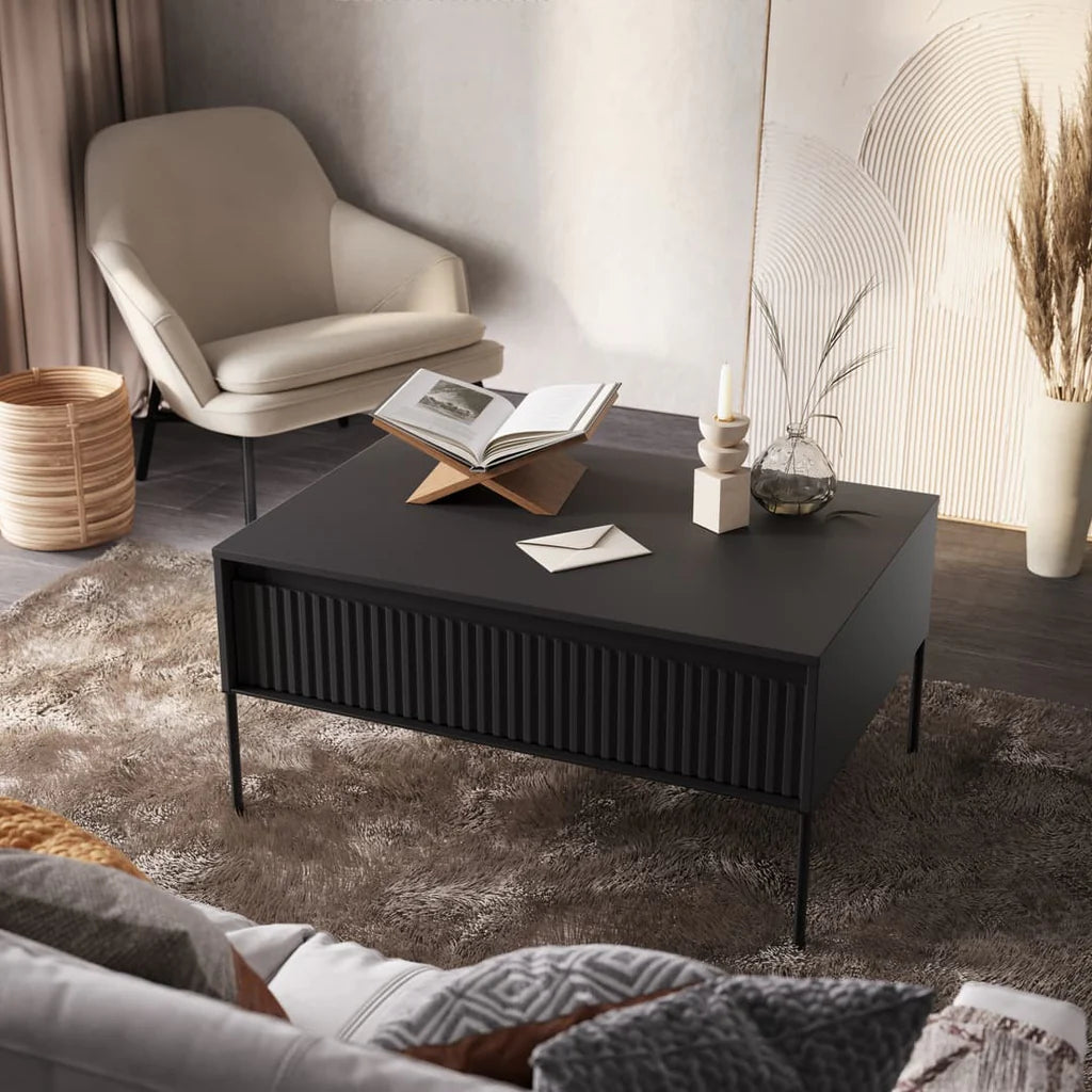 Elevate your living space with the TR-09 Wooden Coffee Table, a sleek and versatile addition to your home. Crafted from 16mm high-quality laminated board, this coffee table exudes modern sophistication. Its minimalist design features black metal legs that effortlessly blend with any décor style. The table's pull-down door, equipped with a convenient push-to-open system, reveals a spacious closed storage compartment, ensuring clutter-free surfaces. Available in an array of captivating colours, the TR-09 Wooden Coffee Table combines functionality and aesthetics, bringing both style and practicality to your living room.