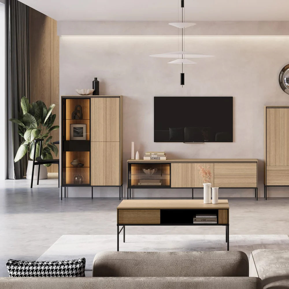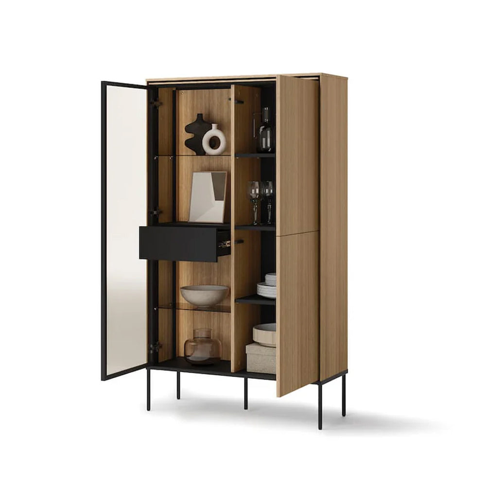 Showcase your style with the Visso Wooden Display Cabinet, a perfect blend of modern elegance and practical storage. Finished in a warm Oak Linear tone and elevated on sleek black metal legs, this cabinet brings contemporary sophistication to any living or dining space.